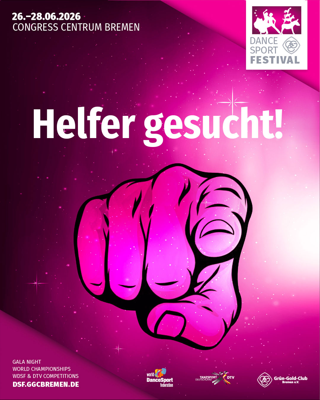 Die nächste Veranstaltung steht vor der Tür – vom 26.06.- 28.06.2026 findet im CCB und Halle 4.1 das Dance Sport Festival 2026 statt. An drei Tagen messen sich wieder nationale und internationale Paare hier in Bremen. Für eine erfolgreiche Durchführung suchen wir wieder euch! In verschiedenen Bereichen – wie z. B. beim Aufbau am Donnerstag, den 25.06.2026, im Catering, im Turnierbüro, als Springer oder in der Kameraführung für den Livestream – freuen wir uns über jede Hilfe und Unterstützung.